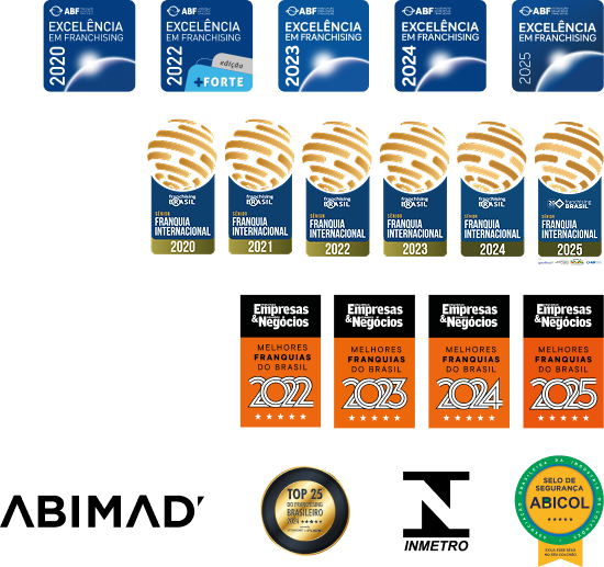 Reconocimiento consecutivo desde 2020 por Franchising Brasil, que avala la madurez, el éxito y la solidez de nuestro modelo de negocio en el escenario internacional.